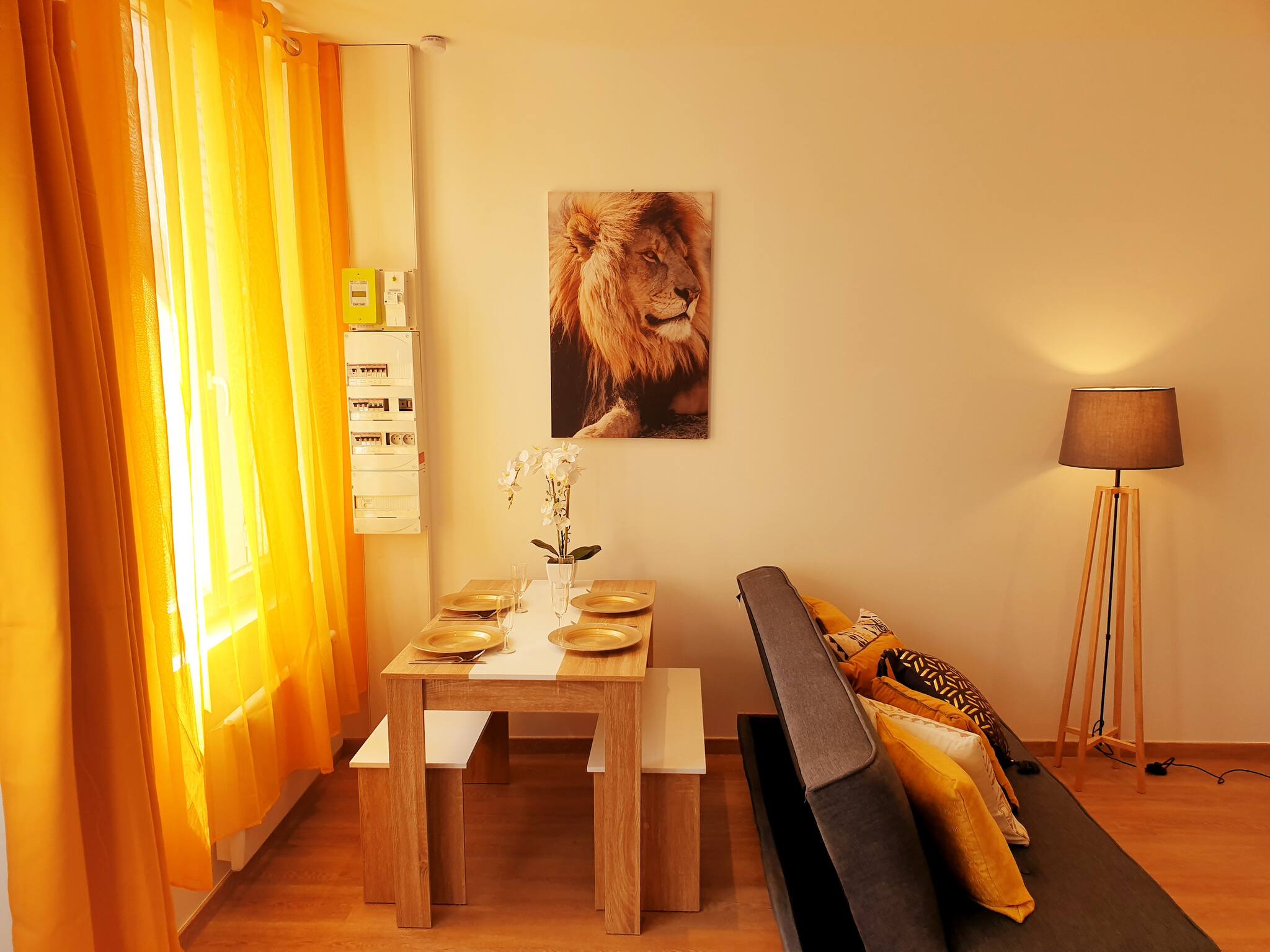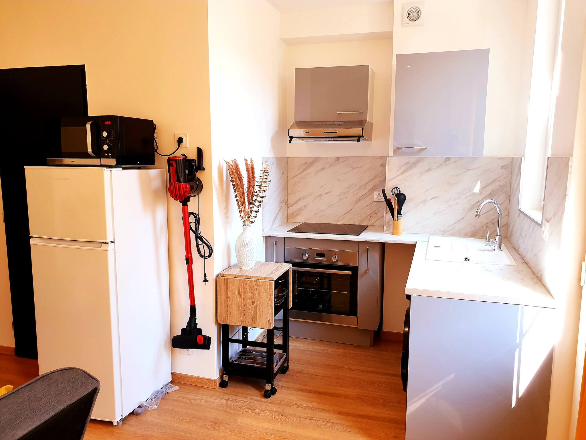 Un salon lumineux , en enfilade entre les deux chambres, pour se détendre ou partager un moment convivial. Une cuisine moderne et entièrement équipée : four, micro-ondes, plaques de cuisson, réfrigérateur-congélateur, machine à café, bouilloire, grille-pain, vaisselle et ustensiles.