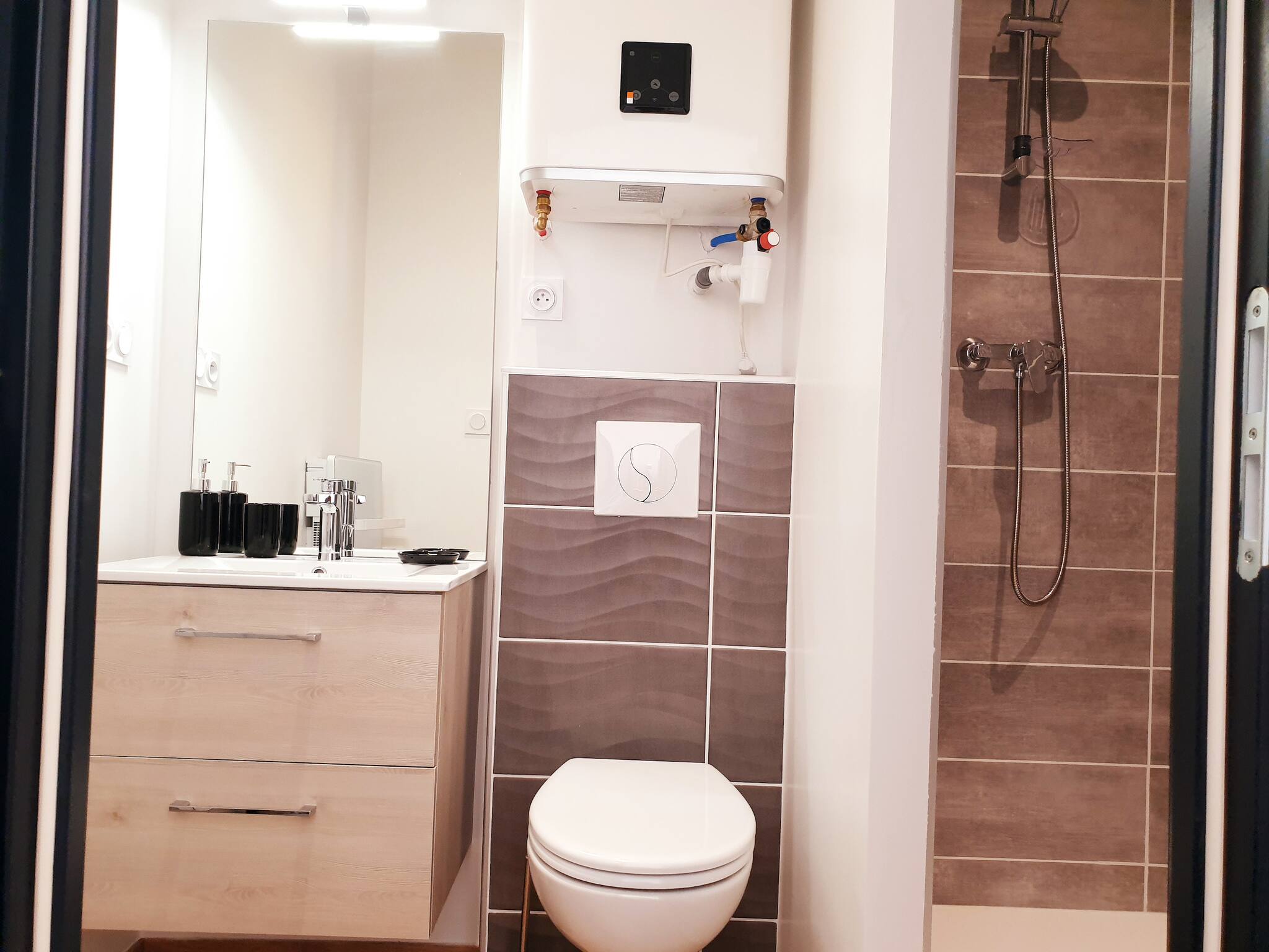 Une salle de bain rénovée avec douche moderne et meuble vasque. Toilettes suspendues séparées pour plus de confort. Connexion Wi-Fi Fibre, idéale pour le télétravail ou le streaming.