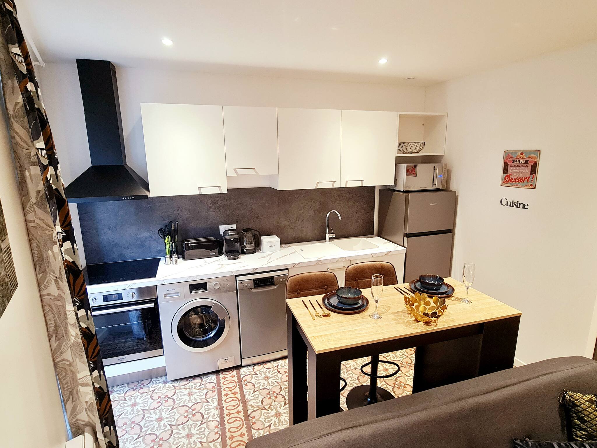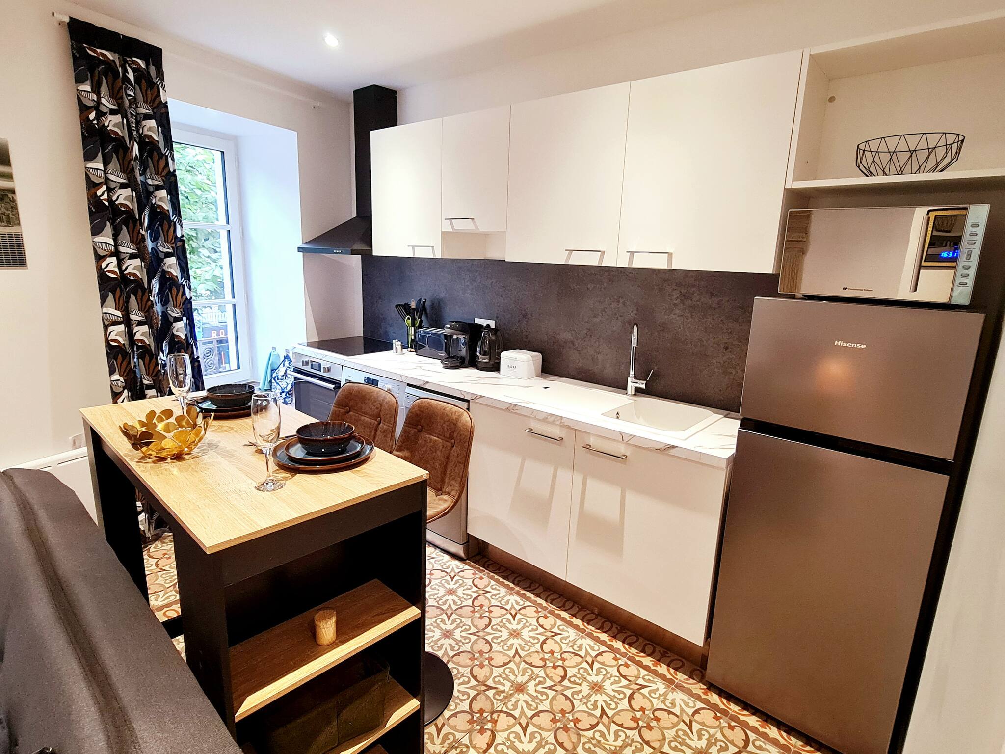 Le Beffroi de Millau – Petit Loft traversant en plein cœur de la villeBienvenue dans Le Beffroi de Millau, un charmant loft traversant de 33 m² situé au 2ᵉ étage sans ascenseur d’un immeuble typique de Millau, à deux pas du rond-point du Mandarous – véritable cœur battant de la ville. Son emplacement est tout simplement idéal : avenue de la République, à proximité immédiate des commerces, restaurants, bars, marchés, centre historique, rues piétonnes et transports en commun. Tout commence ici.Un logement fonctionnel, lumineux et bien pensé – parfait pour un séjour confortable, autonome et pratiqueUne grande pièce de vie façon loftCe logement atypique séduit par sa configuration ouverte et traversante. Une alcôve vient subtilement marquer la séparation entre l’espace nuit et l’espace de vie, offrant à la fois intimité et fluidité.Canapé confortable face à une TV 80 cmCoin repas pour 2 personnesCuisine ouverte entièrement équipée :Réfrigérateur, congélateur, four chaleur tournante, micro-ondes, plaques vitrocéramiques, lave-vaisselle, lave-linge, grille-pain, bouilloire, machine à café Tassimo, ustensiles, vaisselle et produits de première nécessitéCoin nuit en alcôveDélicatement isolé dans l’espace, l’alcôve offre un vrai cocon nuit avec :Lit double (140x190)PenderieSalle d’eau attenante moderne, composée d’une douche extra-plate (110x90) et d’un lavabo suspenduWC suspendu séparé pour plus de confortServices & commodités supplémentairesWi-Fi haut débitAu rez-de-chaussée de l’immeuble : restauration disponible sur commande (petit-déjeuner en supplément), ainsi qu’un salon de thé sur placeEmplacement stratégiqueÀ 5 min du centre commercial de La CapelleÀ deux pas des commerces, bars, restaurants, marchés locauxEn plein centre-ville, à l’entrée du centre historique et touristiqueProche des arrêts de bus et de taxis pour faciliter tous vos déplacementsStationnementStationnement public payant au pied de l'immeubleParking gratuit de la Grave (900 m – 15 min à pied)Stationnement gratuit au parc de la Victoire (850 m – 12 min à pied)Réservez dès maintenant "Le Beffroi de Millau", un loft cosy, astucieusement agencé, au rapport qualité-prix imbattable, pour découvrir Millau dans les meilleures conditions.