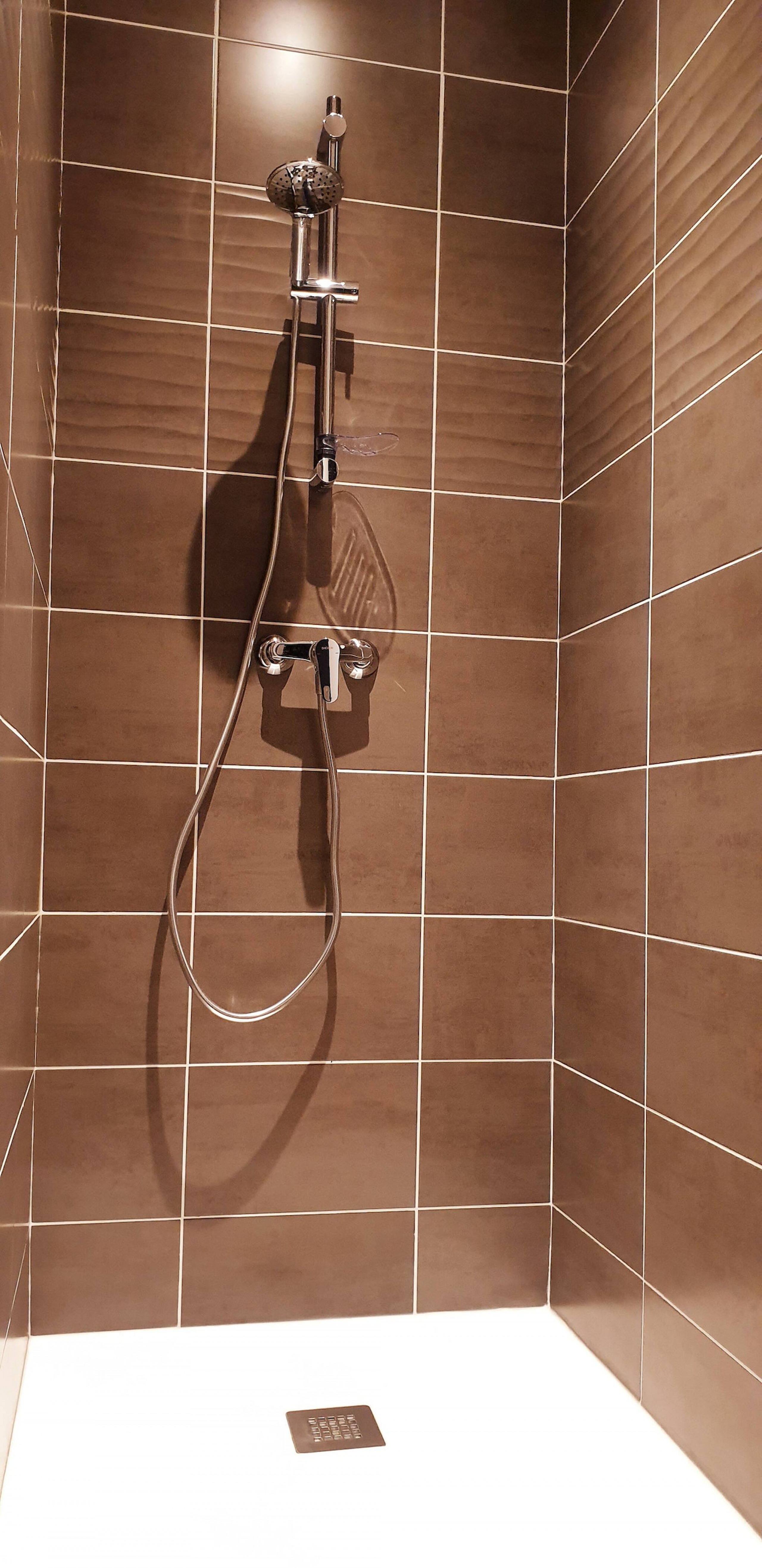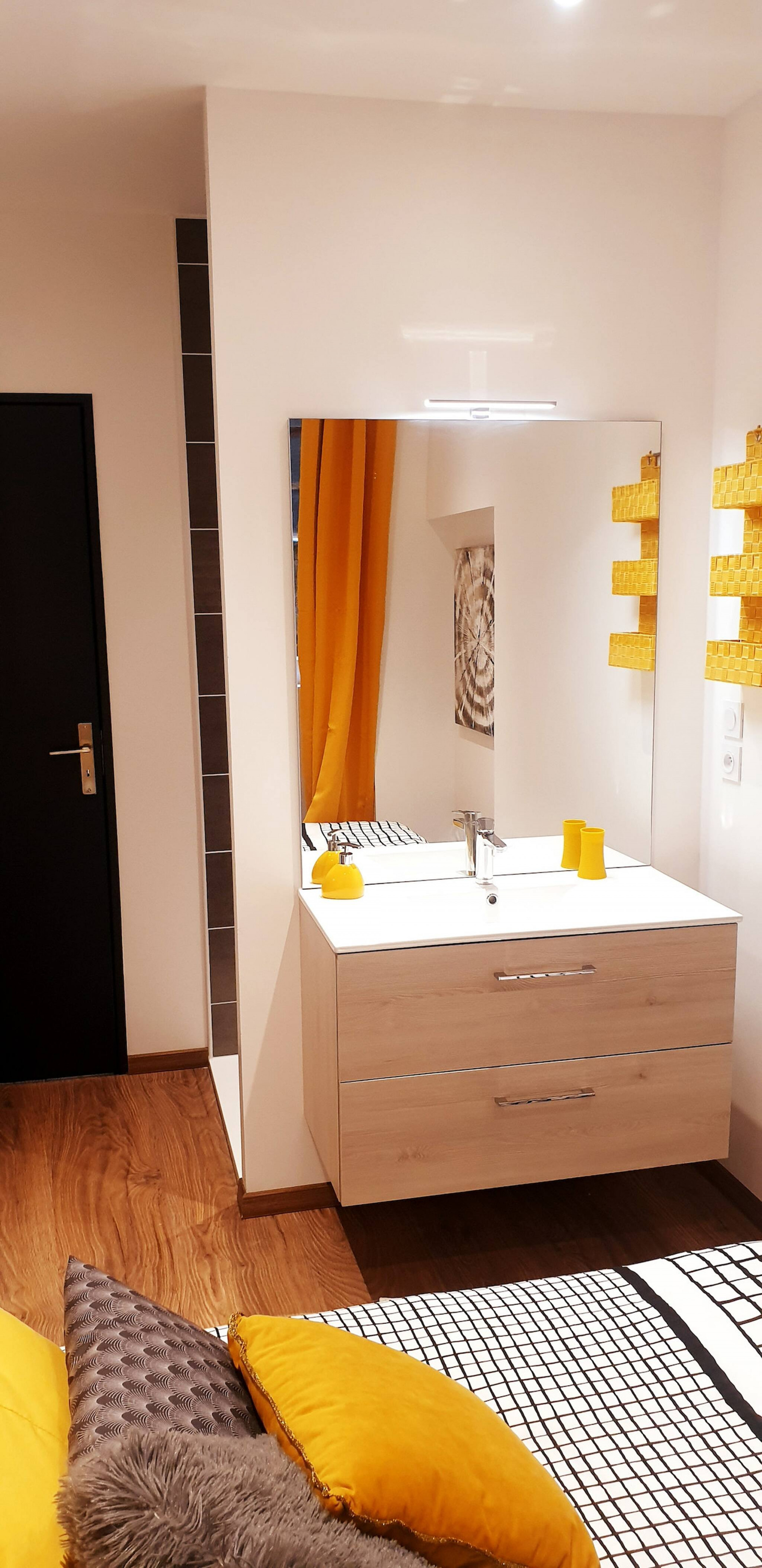 Niveau 1 – Espace nuit confortable et bien pensé. Vous trouverez une chambre paisible avec : Lit double 140x190 - Bureau pour télétravailler sereinement. Grand placard mural intégré. La salle de bain attenante offre un confort optimal : Douche moderne et spacieuse (bac extra plat 110x90) Lavabo suspendu Toilettes suspendues et chauffe-serviettes électrique. Serviettes douces et gel de toilette fournis.
