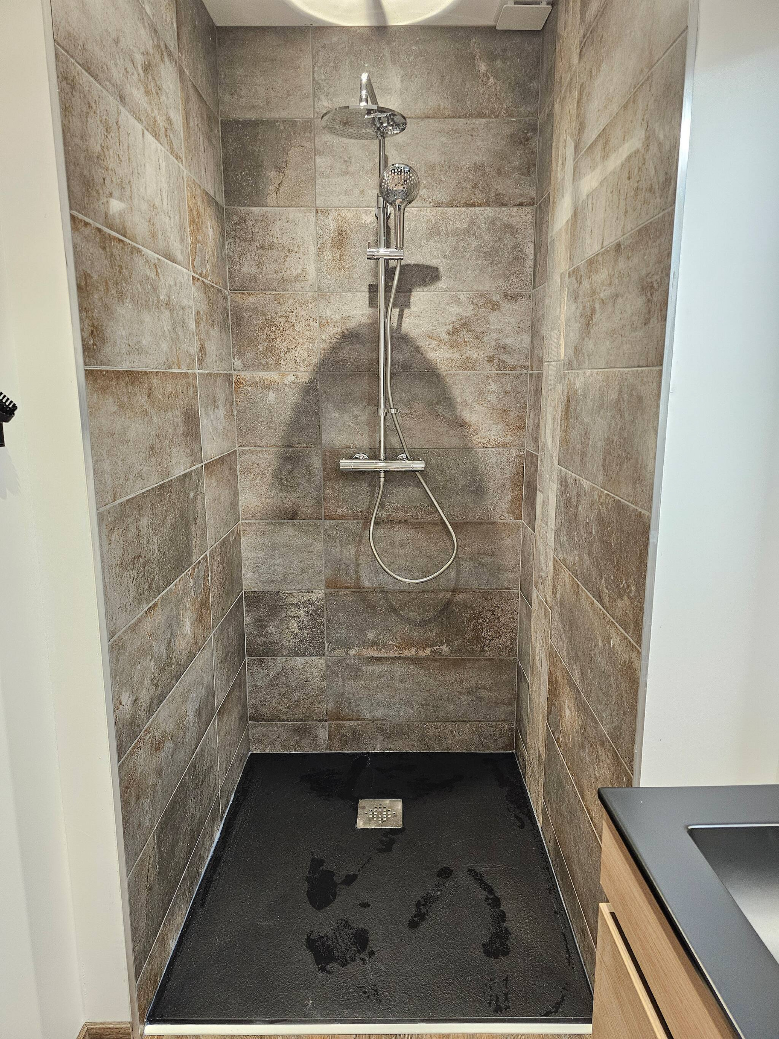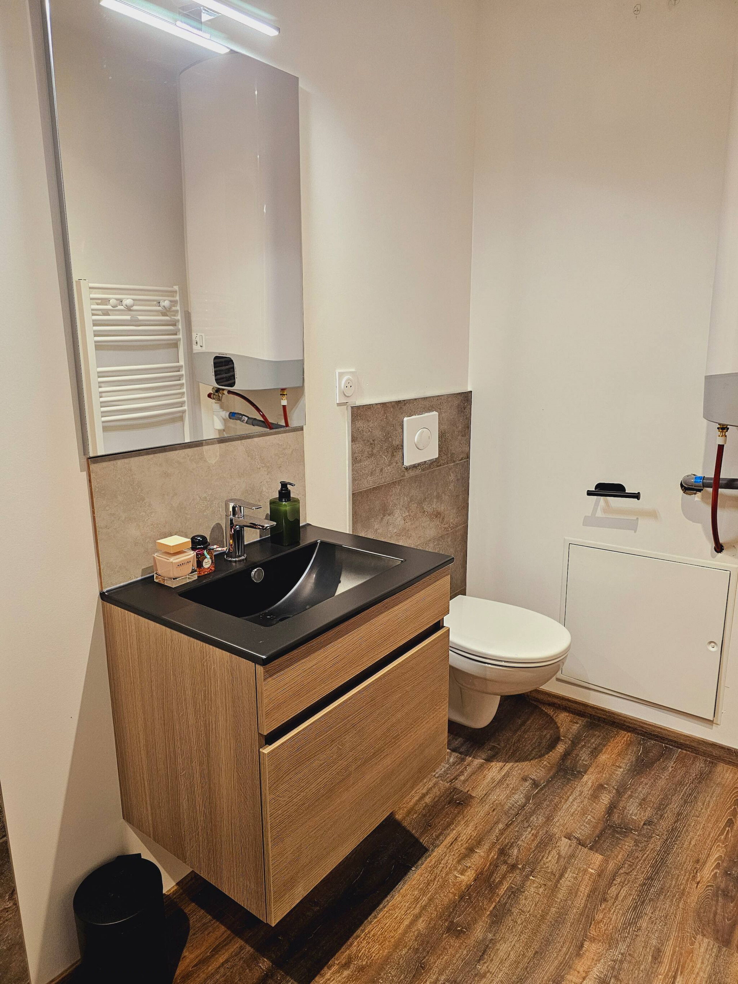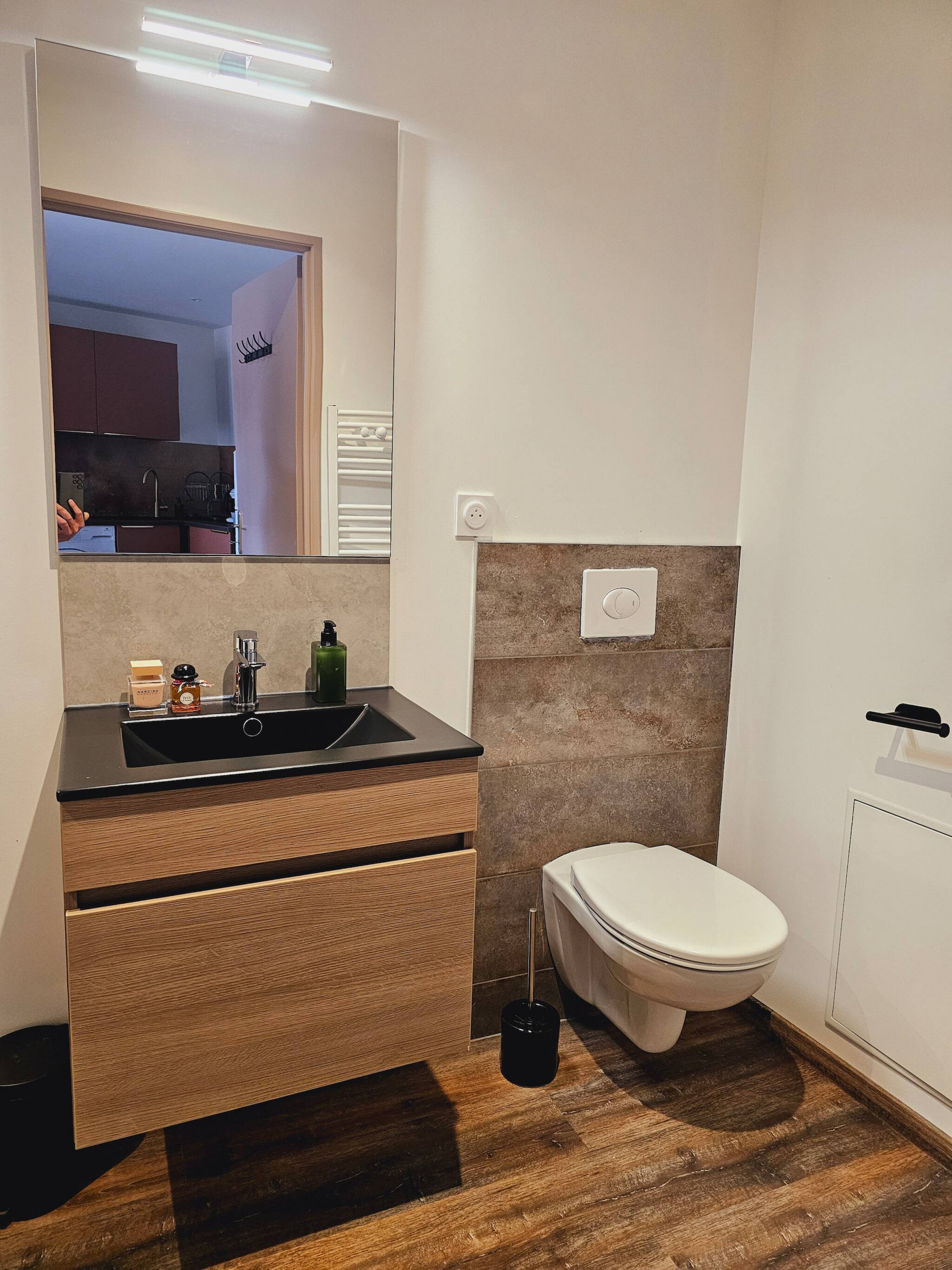 La salle de bain, récemment rénovée, est équipée d'une douche spacieuse, d'un lavabo moderne et de toilettes. Des serviettes douces et des articles de toilette de base sont fournis pour votre confort. La propreté et le design contemporain de cette salle de bain ajoutent une touche de luxe à votre séjour.