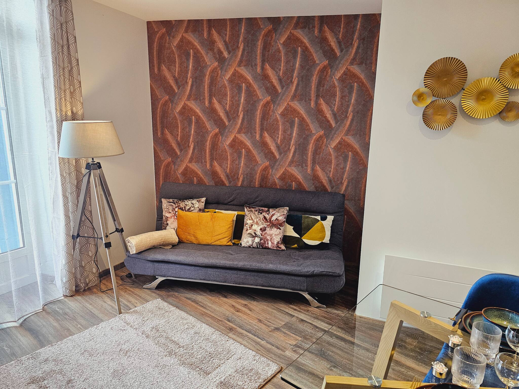 Le salon est le cœur du logement, où vous pouvez vous détendre après une journée bien remplie. Aménagé avec des canapés confortables et une télévision à écran plat, il est parfait pour des soirées cinéma en famille ou entre amis. La décoration moderne et chaleureuse invite à la relaxation. Le salon donne un accès direct au balcon, offrant une belle lumière naturelle et un espace extérieur agréable.