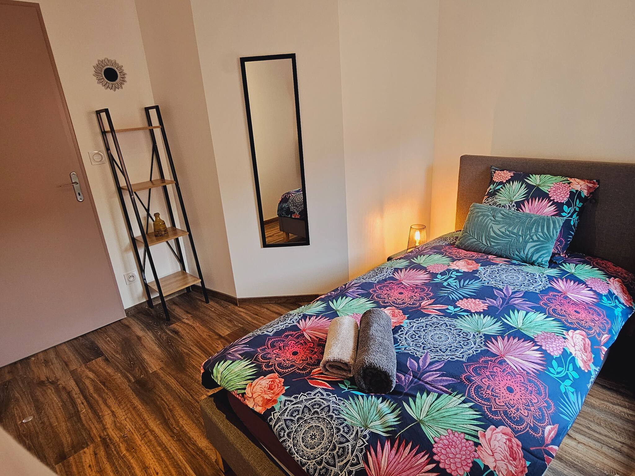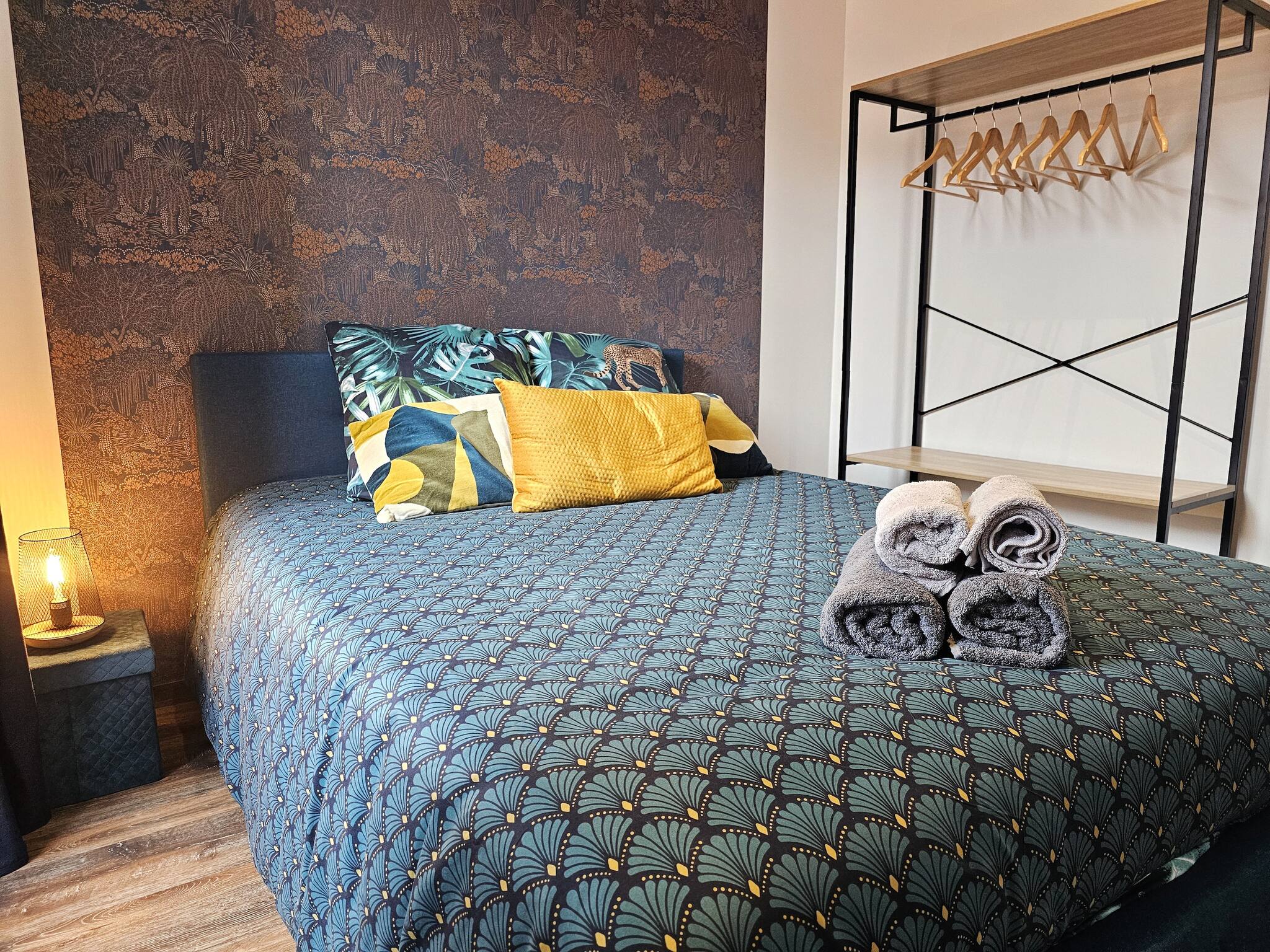 La première chambre est équipée d'un lit double de 140x190. Avec ses draps doux et son matelas confortable, cette chambre est idéale pour des nuits reposantes. La décoration est sobre et élégante, avec des tons neutres qui créent une atmosphère apaisante. Une étagère est à votre disposition pour ranger vos affaires en toute commodité.
