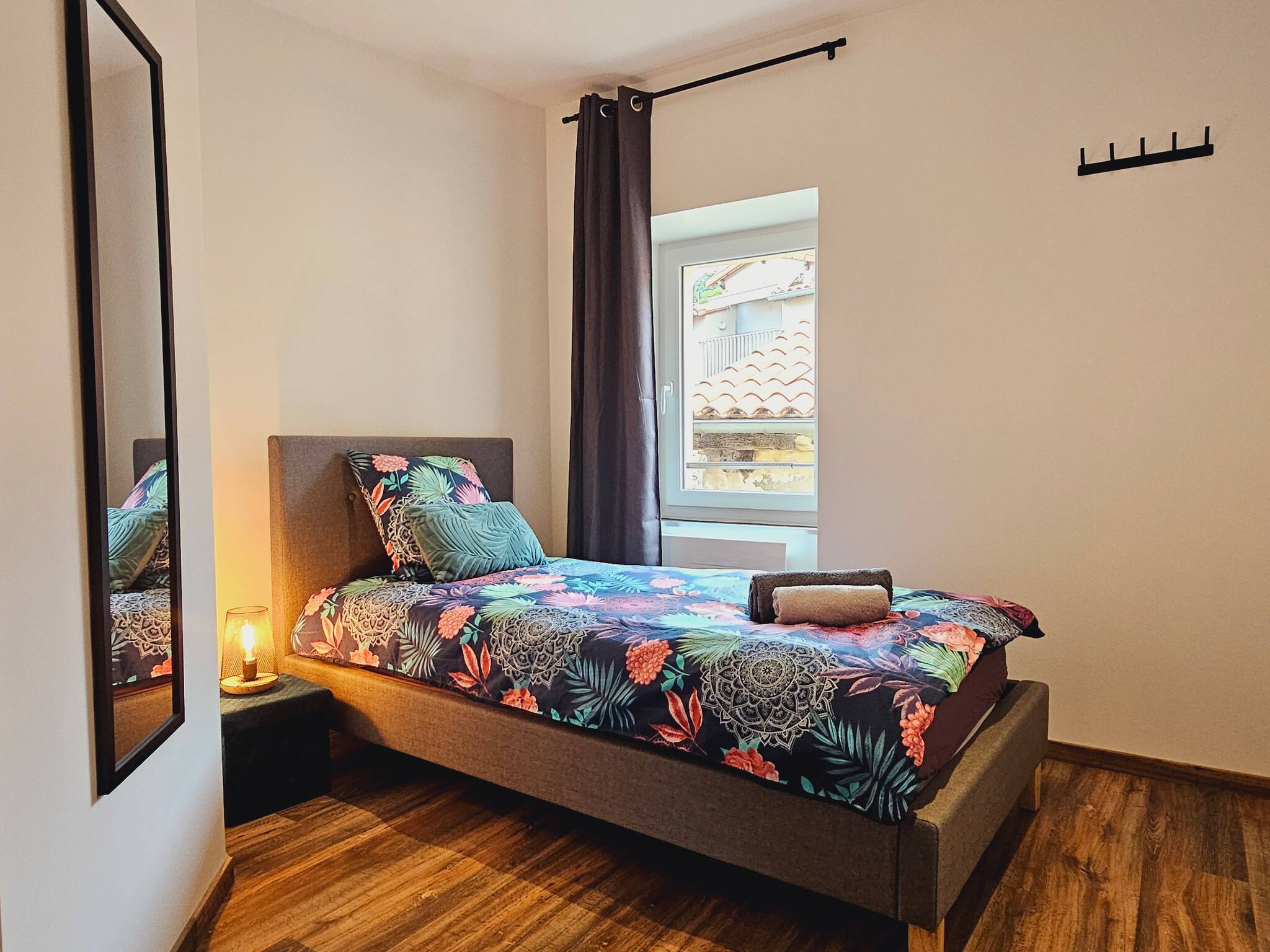 La deuxième chambre dispose d'un lit simple de 90x190, parfait pour un enfant ou un invité. Cette chambre est également décorée avec soin, offrant un espace de repos agréable.